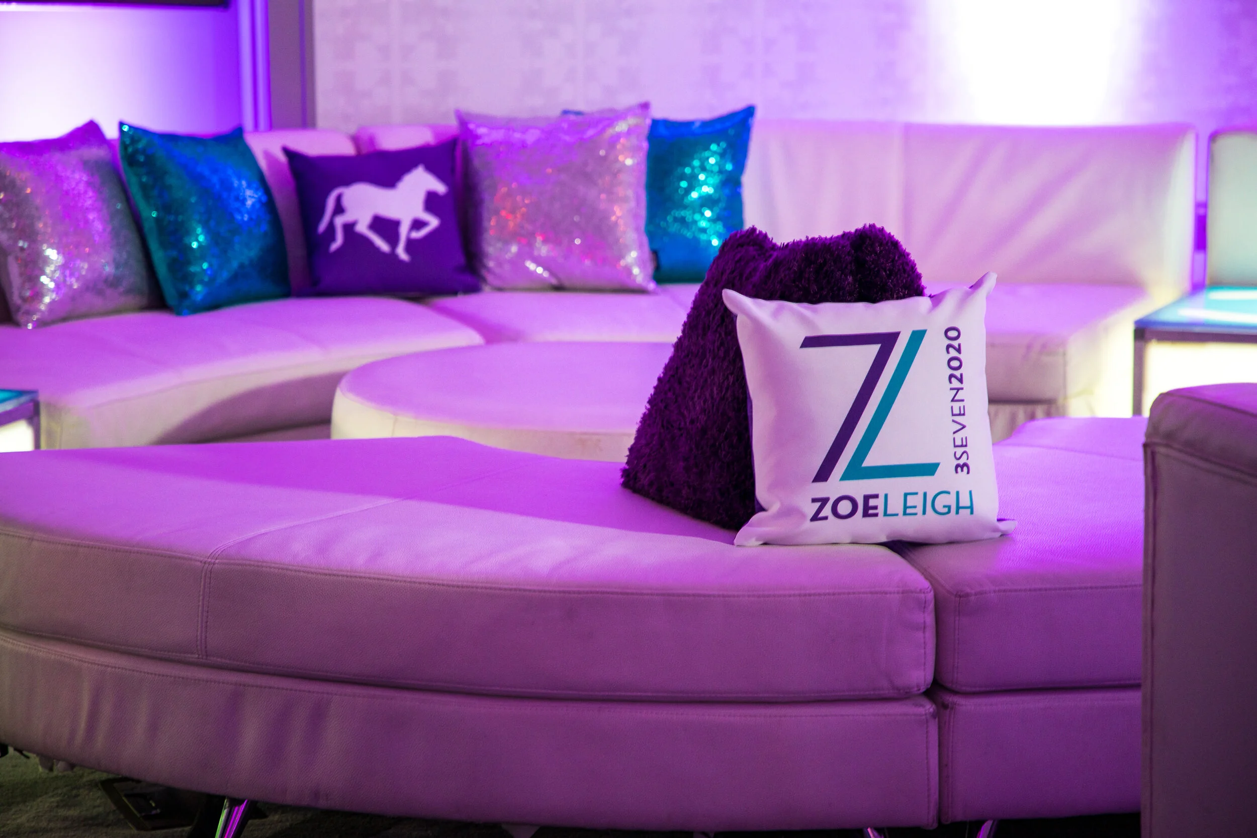 Design of escort card board, escort cards (horseshoes and cards), vinyl decals for table tops and lamps, custom pillows, table numbers.